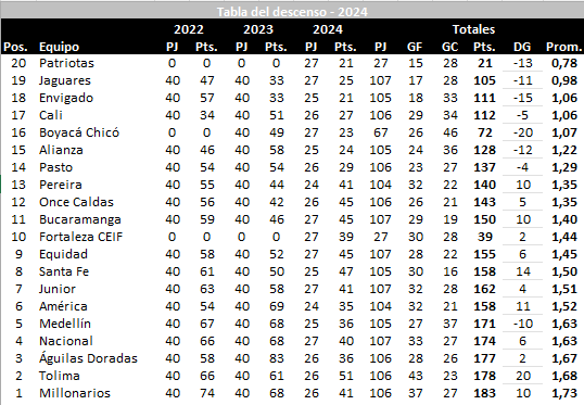 Deportivo Cali está en el puesto del 17, al borde del descenso, con un promedio de 1.06, el mismo que el del Envigado. Aun salvándose del descenso en el presente año, hoy por hoy el equipo comenzará seriamente comprometido con la lucha para salvar la categoría en el 2025.