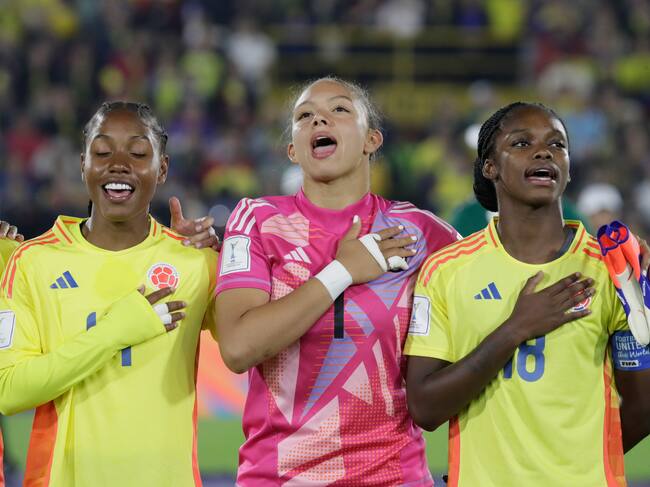 AME5545. BOGOTÁ (COLOMBIA), 03/09/2024.- Linda Caicedo (d), Luisa Agudelo (c) y Sintia Cabezas de Colombia forman este martes, en un partido del grupo A de la Copa Mundial Femenina sub-20 entre las selecciones de Colombia y Camerún en el estadio de El Campín en Bogotá (Colombia). EFE/ Carlos Ortega / Carlos Ortega (EFE)
