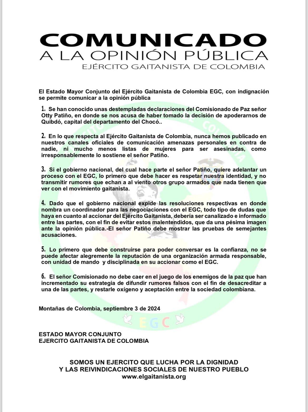 Y agregó al respecto: “Si el gobierno nacional, del cual hace parte el señor Patiño, quiere adelantar un proceso con el EGC, lo primero que debe hacer es respetar nuestra identidad y no transmitir rumores que echan a al viento otros grupos armados que nada tienen que ver con el movimiento gaitanista”.