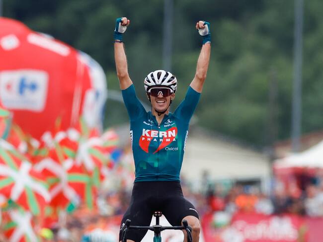 El ciclista español del Kern Pharma Urko Berrade celebra su victoria durante la decimoctava etapa de la Vuelta a España, de 179,5 kilómetros con salida en Vitoria y llegada en el Parque Natural de Izki, este jueves. EFE/Javier Lizón / Javier Lizón (EFE)