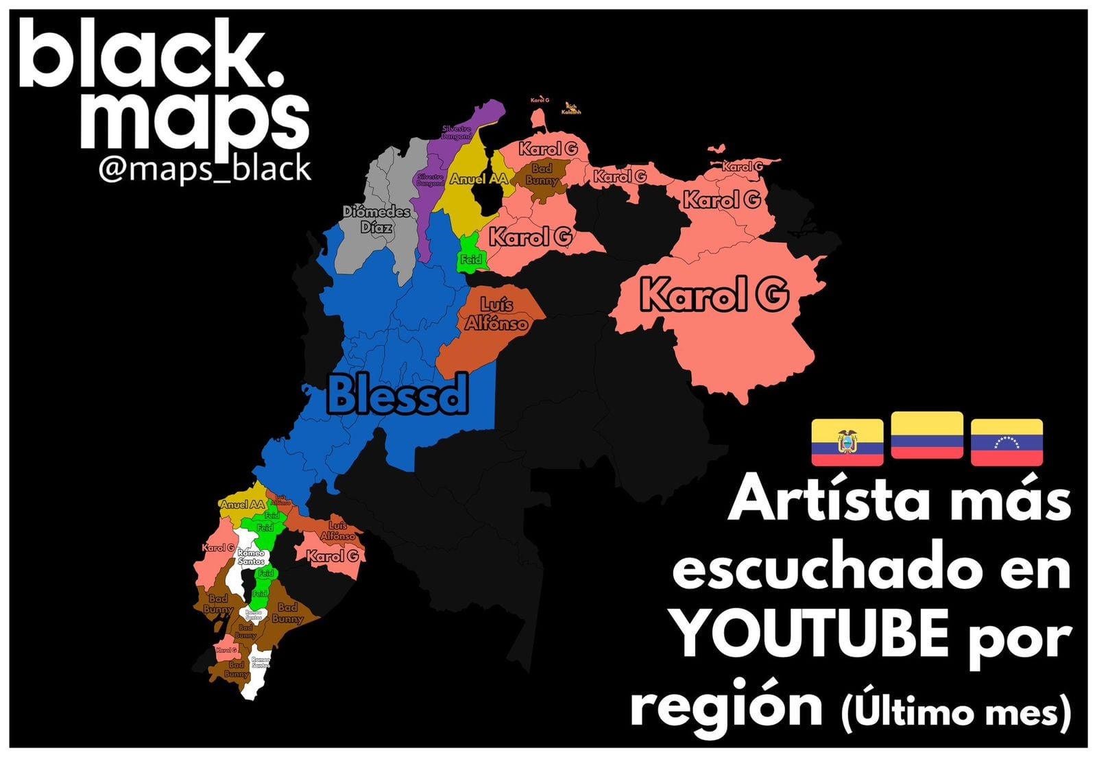 Blessd fue uno de los artistas más escuchados por los colombianos en la plataforma de YouTube. El artista paisa lideró el listado en departamentos como Nariño, Cauca, Valle del Cauca, Huila, Meta, Chocó, Cundinamarca, Boyacá, Santander, Norte de Santander, Antioquia, Risaralda y Quindío.