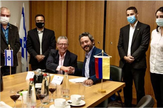 La fotografía muestra el encuentro entre Yair Kulas, jefe del Departamento de Asistencia a las Exportaciones del Ministerio de Defensa de Israel y Jairo García, viceministro de Defensa del gobierno Duque.