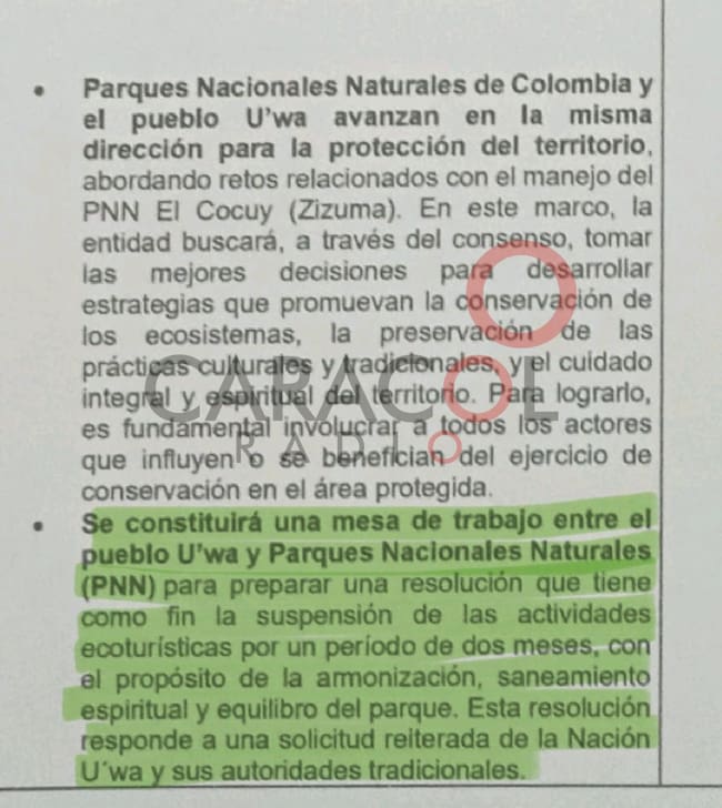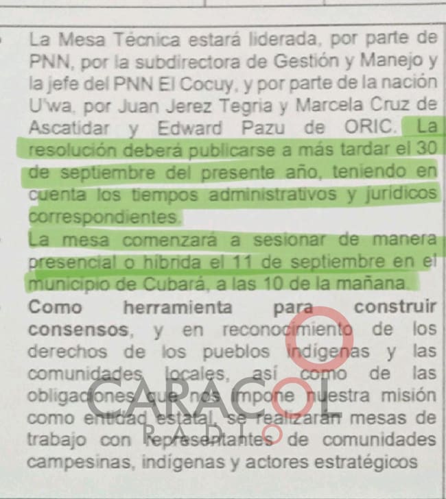 Para concertar esta resolución, a partir de hoy inicia la mesa técnica entre los delegados de los indígenas u’wa y el equipo de trabajo de Parques Nacionales de Colombia, quienes tienen el compromiso de avanzar con este documento: