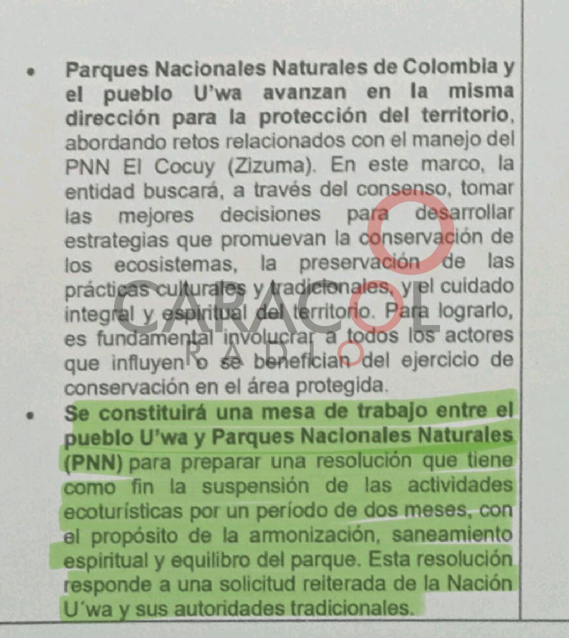 Para concertar esta resolución, a partir de hoy inicia la mesa técnica entre los delegados de los indígenas u’wa y el equipo de trabajo de Parques Nacionales de Colombia, quienes tienen el compromiso de avanzar con este documento: