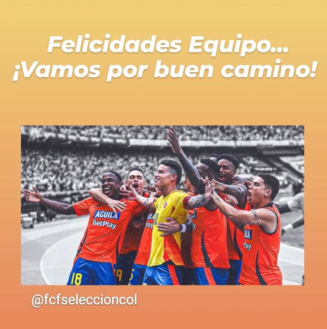 En su cuenta de Instagram, Falcao escribió: “Felicidades, equipo... ¡Vamos por buen camino!”, junto a una fotografía de James Rodríguez celebrando el gol de la victoria en un lanzamiento desde el punto penalti.