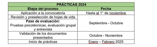 Asimismo, estás son las fechas y fases que debe tener en cuenta para postularse a las prácticas: