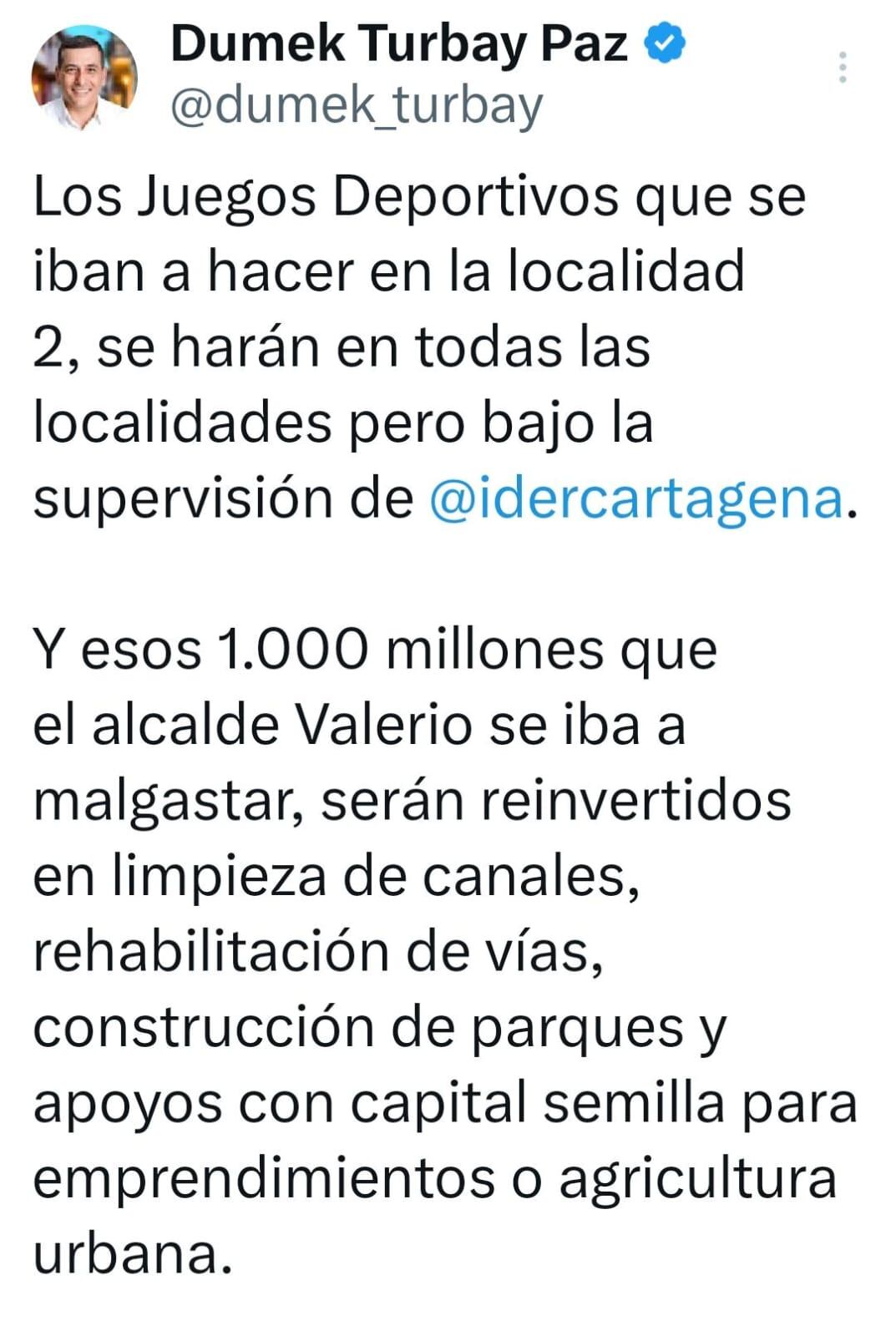 Indicó, “con el fin de disipar dudas y garantizar la transparencia de un proceso serio y ajustado a la ley de contratación pública, la Alcaldía Local suspende la programación temporal de los Juegos de la Localidad Virgen y Turística; de común acuerdo con el contratista y siguiendo las directrices del Señor Alcalde Mayor de Cartagena, Dumek Turbay Paz, se ha decidido suspender temporalmente la programación el inicio de estos juegos; revisión técnica, jurídica y económica del contrato”.