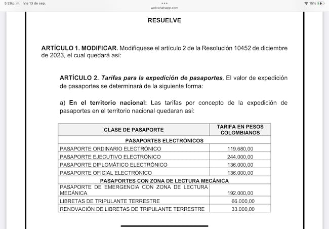 El documento aclara que las tarifas no incluyen el valor del impuesto de timbre regulado por el ministerio de Hacienda y que los pasaportes con zona de lectura mecánica solamente se expedirían en Venezuela, Ecuador, Perú, Brasil y Panamá.
