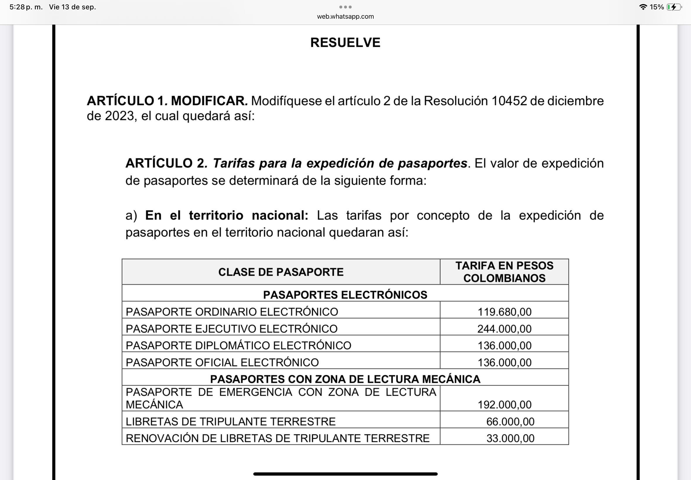 El documento aclara que las tarifas no incluyen el valor del impuesto de timbre regulado por el ministerio de Hacienda y que los pasaportes con zona de lectura mecánica solamente se expedirían en Venezuela, Ecuador, Perú, Brasil y Panamá.