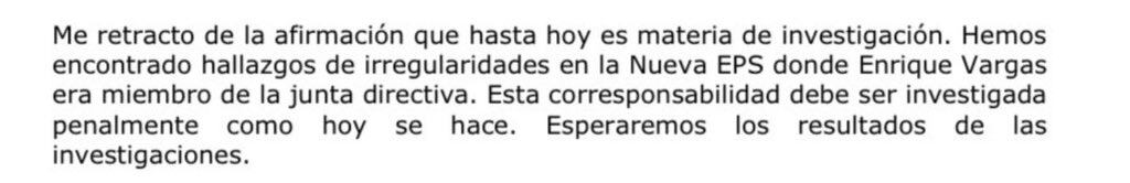 ”Me retracto de la afirmación que hasta hoy es materia de investigación. Hemos encontrado hallazgos de irregularidades en la Nueva EPS donde Enrique Vargas era miembro de la junta directiva. Esta corresponsabilidad debe ser investigada penalmente como hoy se hace.”