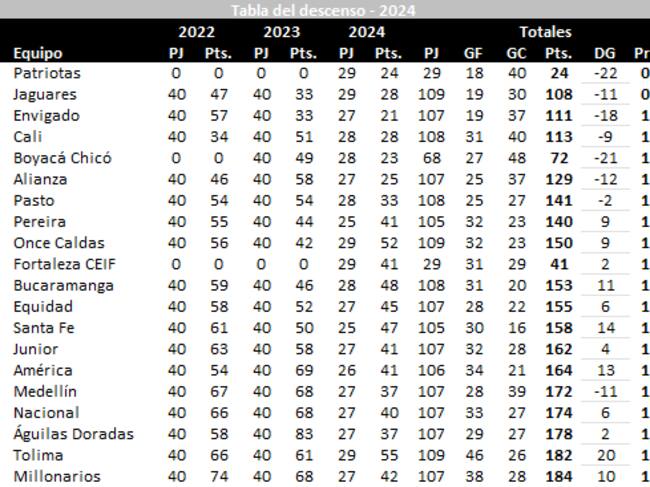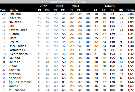 Para el 2024, los dos equipos que ascendieron fueron Patriotas y Fortaleza, clubes que tendrán su conteo de promedio solamente por lo que hagan durante el año. A las 18 instituciones restantes, se le tiene en cuenta los puntos desde el año 2022.