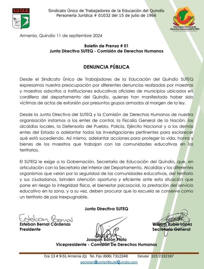 A través de un comunicado se pronunció el sindicato de educadores del departamento, Suteq, quienes evidenciaron su preocupación por la situación de seguridad y salud mental tras actos de extorsión en contra de profesores adscritos a las instituciones educativas oficiales ubicados en la zona cordillerana.