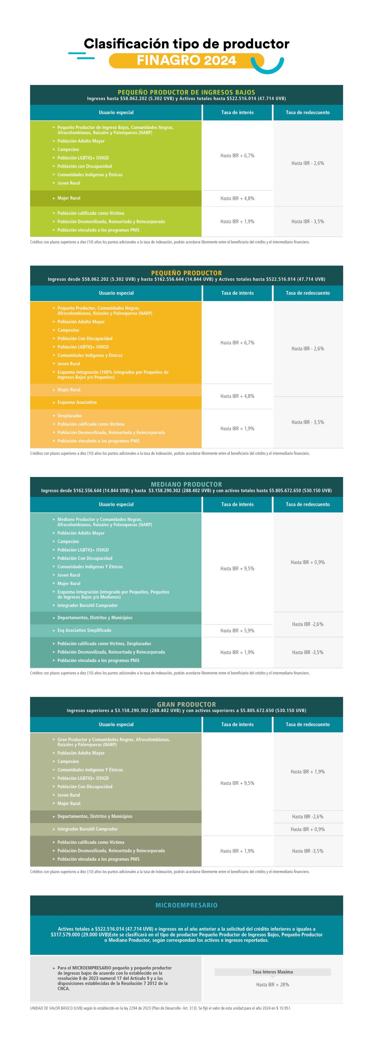 Actualmente, existen cinco tipos de productores clasificados de la siguiente forma: pequeño productor de ingresos bajos, pequeño productor, mediado producto, gran productor y microempresario. La tasa máxima para pequeño productor (persona natural que tiene activos no mayores a 284 smlmv) es hasta DTF + 7 E.A. y la de otros productores es hasta DTF + 10 EA.