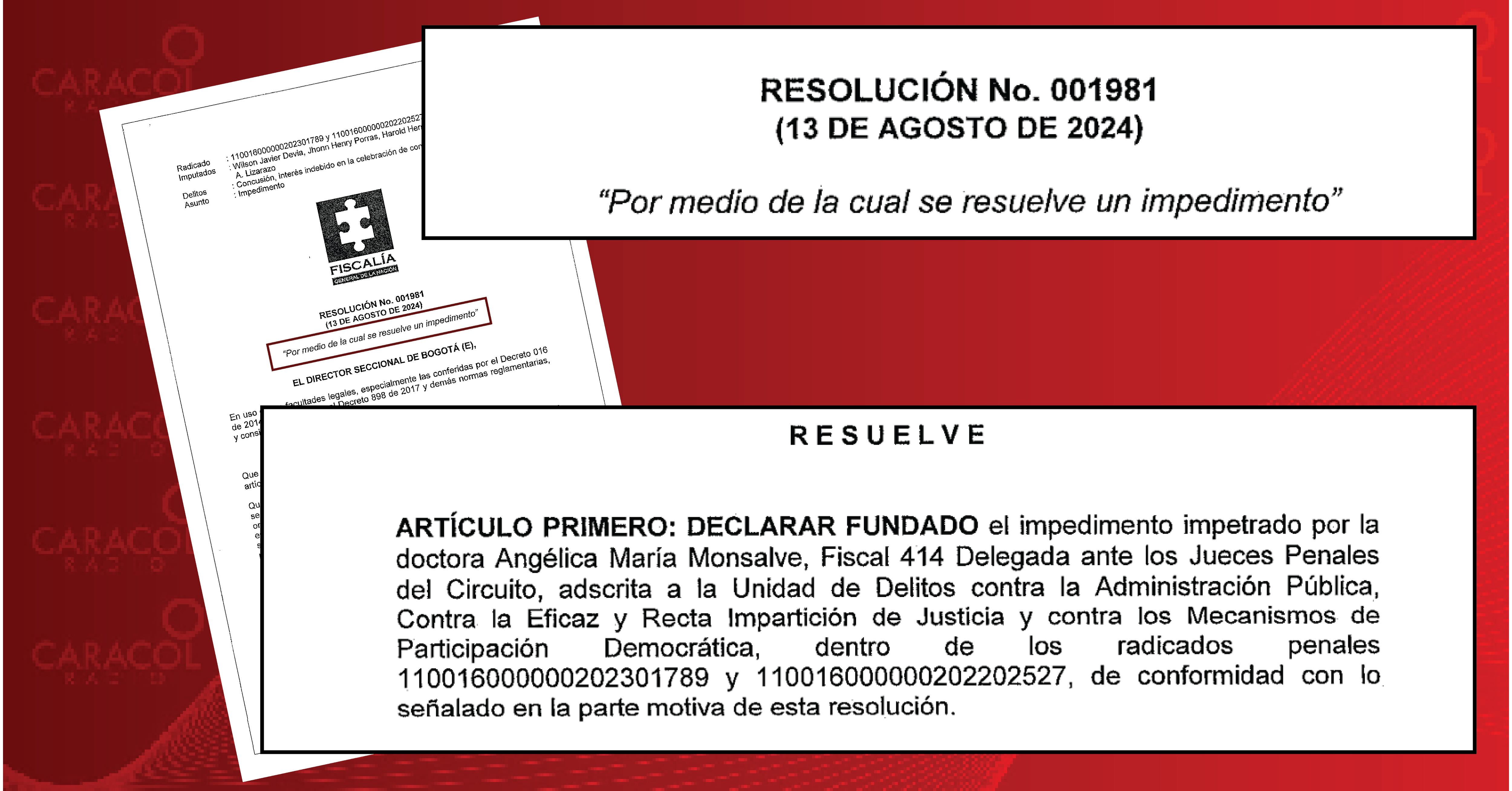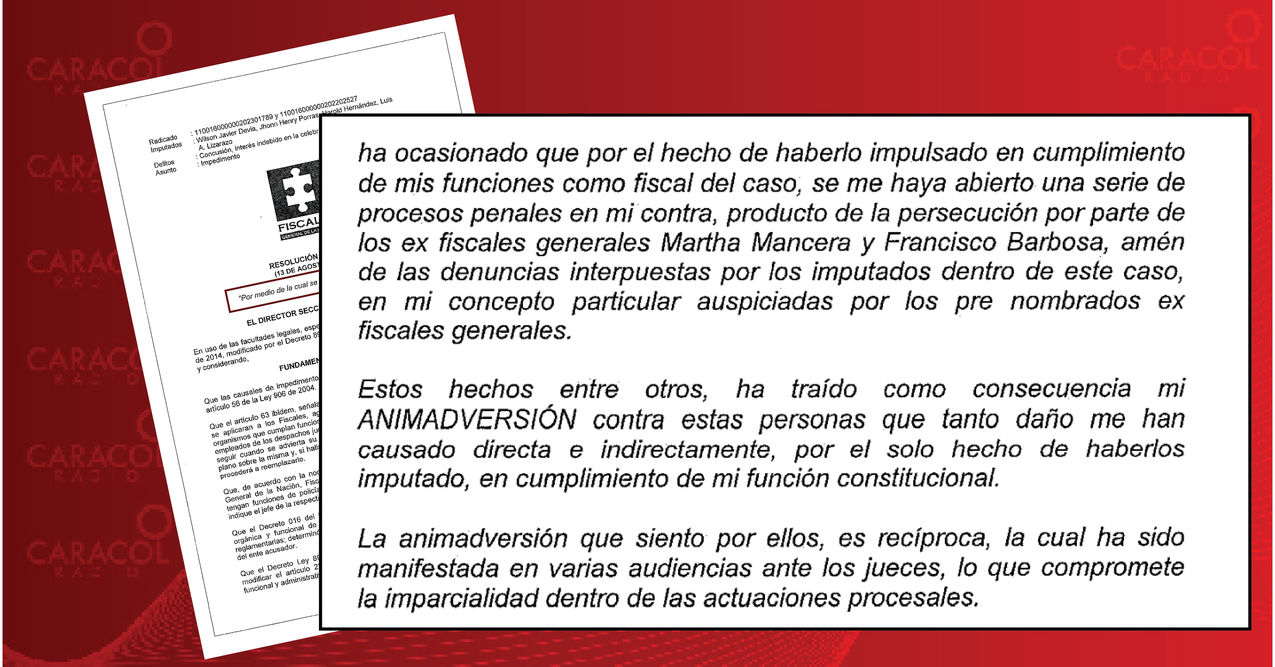Caracol Radio conoció que, desde el 13 de agosto, la fiscal Monsalve fue apartada de otros dos procesos relacionados con el caso “blindados”. Ella admitió que existe una “animadversión” que “compromete su imparcialidad” por las constantes rencillas públicas con los procesados.