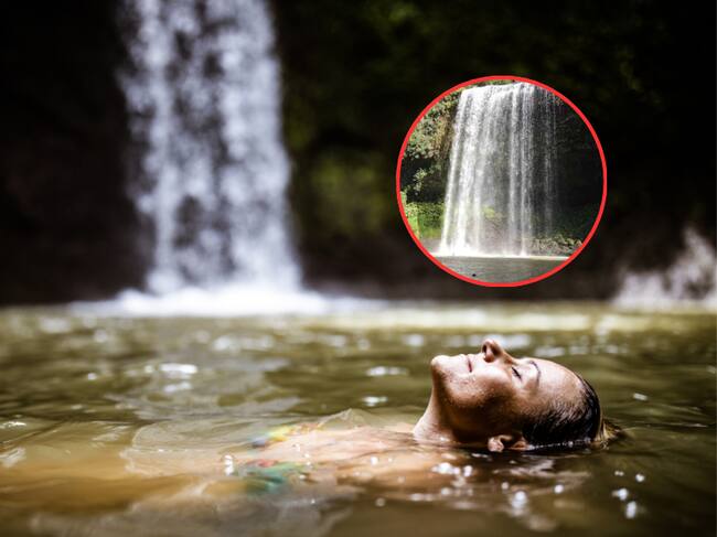 Persona disfrutando de un baño en una cascada y al fondo la cascada colombiana 'Telares de Cristal) (Fotos vía Getty Images y sitio web oficial del municipio de Mesetas, Meta)