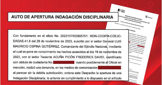 Caracol Radio pudo establecer que, al teniente del Ejército Nacional, Fedrerik David Acuña Picón, le abrieron una nueva investigación disciplinaria por haber expuesto en medios de comunicación el presunto “complot express” que se creó desde las Fuerzas Militares, para sacar al general Jhon Rojas, conocido como el “general de la Paz”.