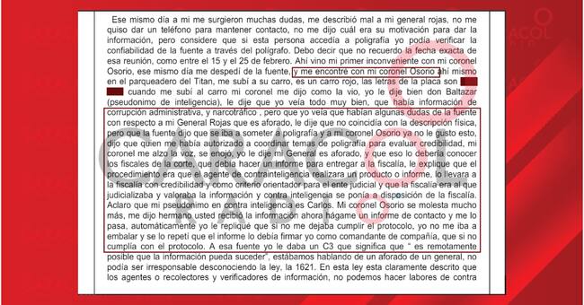 El teniente Acuña confesó que, en cuestión de horas, varios generales crearon una serie de informes para salpicar al entonces general Jhon Rojas en supuestos actos de corrupción con el objetivo de sacarlo del comando que dirigía en el Cauca. Entre los generales mencionados de la creación de ese “complot”, aparece el entonces comandante del Ejército, hoy general en retiro, Luis Mauricio Ospina.