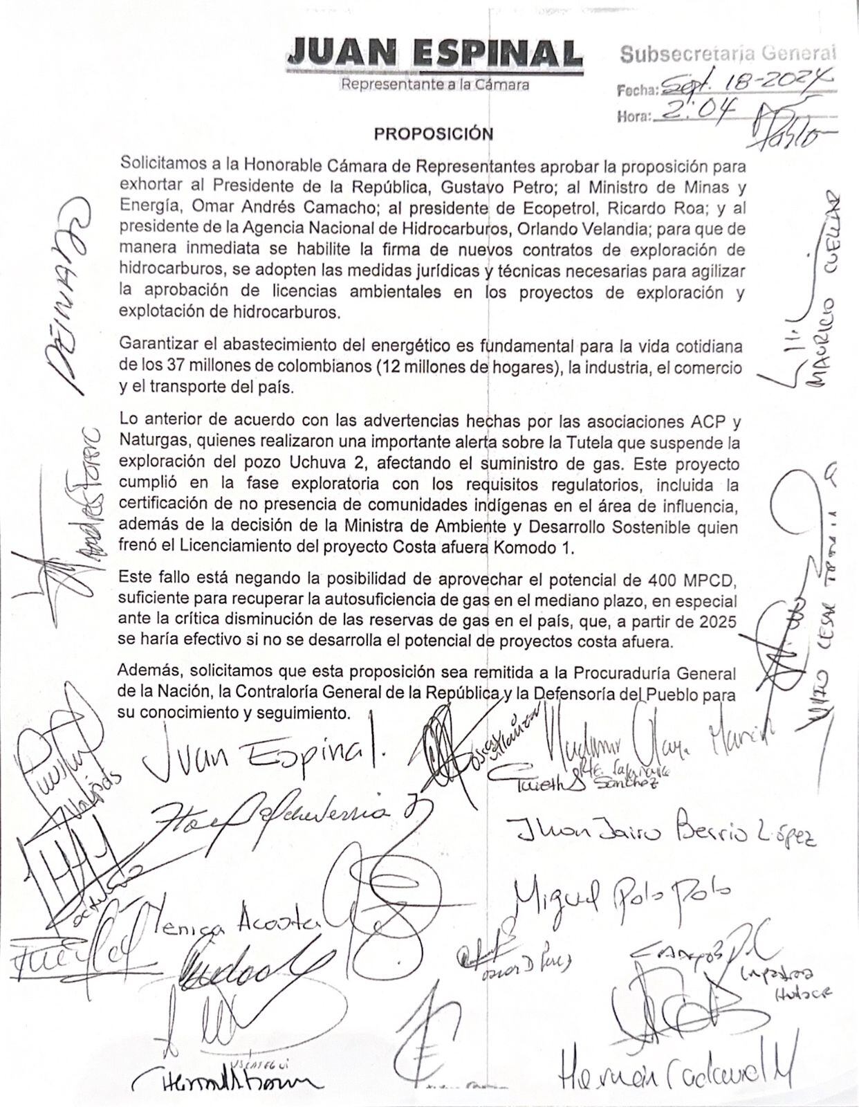 24 congresistas entre los que se encuentran, los representantes a la Cámara de Representantes, Juan Espinal, Miguel Polo Polo y Andrés Forero, presentaron una proposición en la que piden al presidente Gustavo Petro, al ministro de Minas, Andrés Camacho, a Ricardo Roa, Presidente de Ecopetrol y al Presidente de la Agencia Nacional de Hidrocarburos, Orlando Velandia, firmar nuevos contratos de exploración y agilizar la aprobación de licencias ambientales de estos proyectos, ante la posible crisis energética que puede vivir el país en 2025.