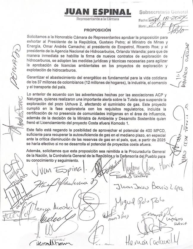 La proposición también se refirió al proyecto de exploración del pozo Uchuva 2 que fue suspendido por un juez. " Este fallo está negando la posibilidad de aprovechar el potencial para recuperar la autosuficiencia de gas en el mediano plazo”, dice en el documento.