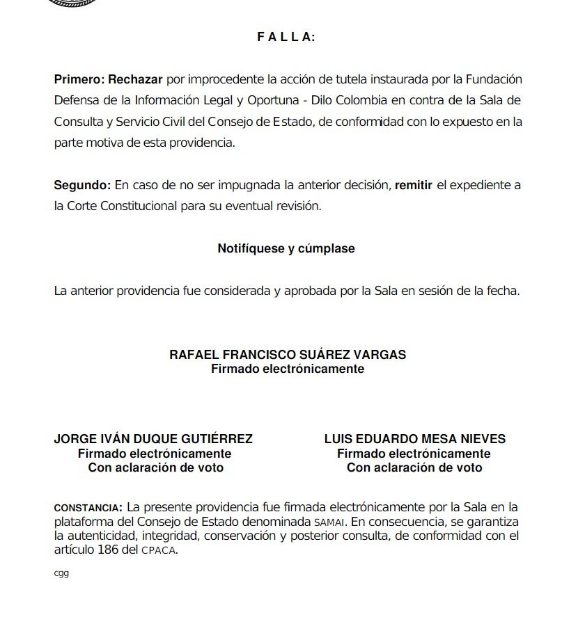 “La Fundación DILO Colombia no ostenta un interés sustancial, directo y particular respecto de la solicitud de amparo, en tanto no alega la amenaza o vulneración a un derecho fundamental propio; por el contrario, el derecho al debido proceso y la garantía del juez natural que se pretenden resguardar no están en cabeza de la accionante, sino de otra persona, es decir, el presidente Gustavo Francisco Petro”, señala uno de los apartes de la decisión.