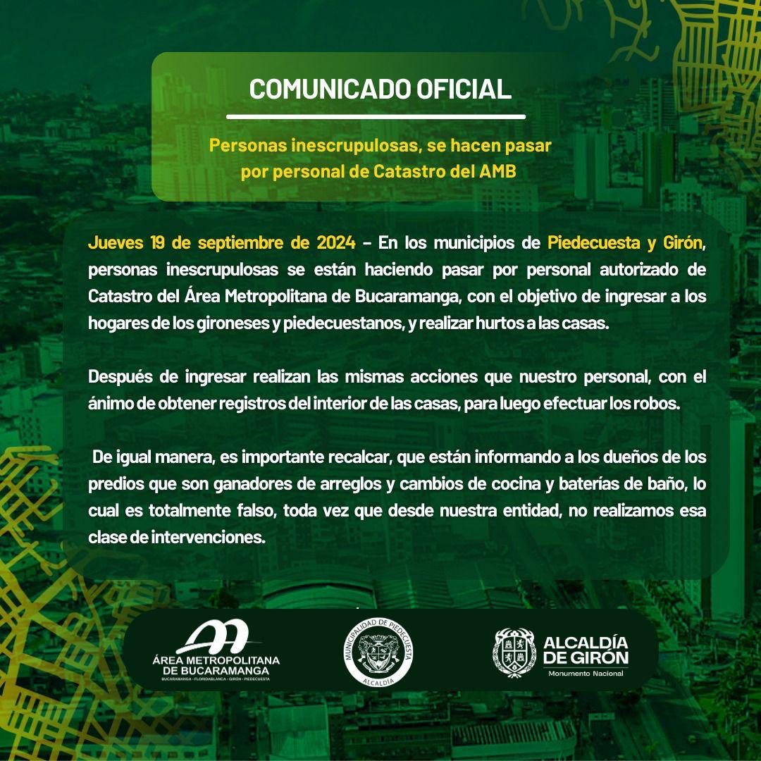 “Sin embargo, ante cualquier duda, los ciudadanos pueden comunicarse a los números de atención: - Catastro Piedecuesta: 3102430078 - Catastro Girón: 3106366433 Agradecemos la divulgación de esta importante información, para evitar que se cometan actos delictivos, abusando de la buena fe de los ciudadanos”, comunicó.