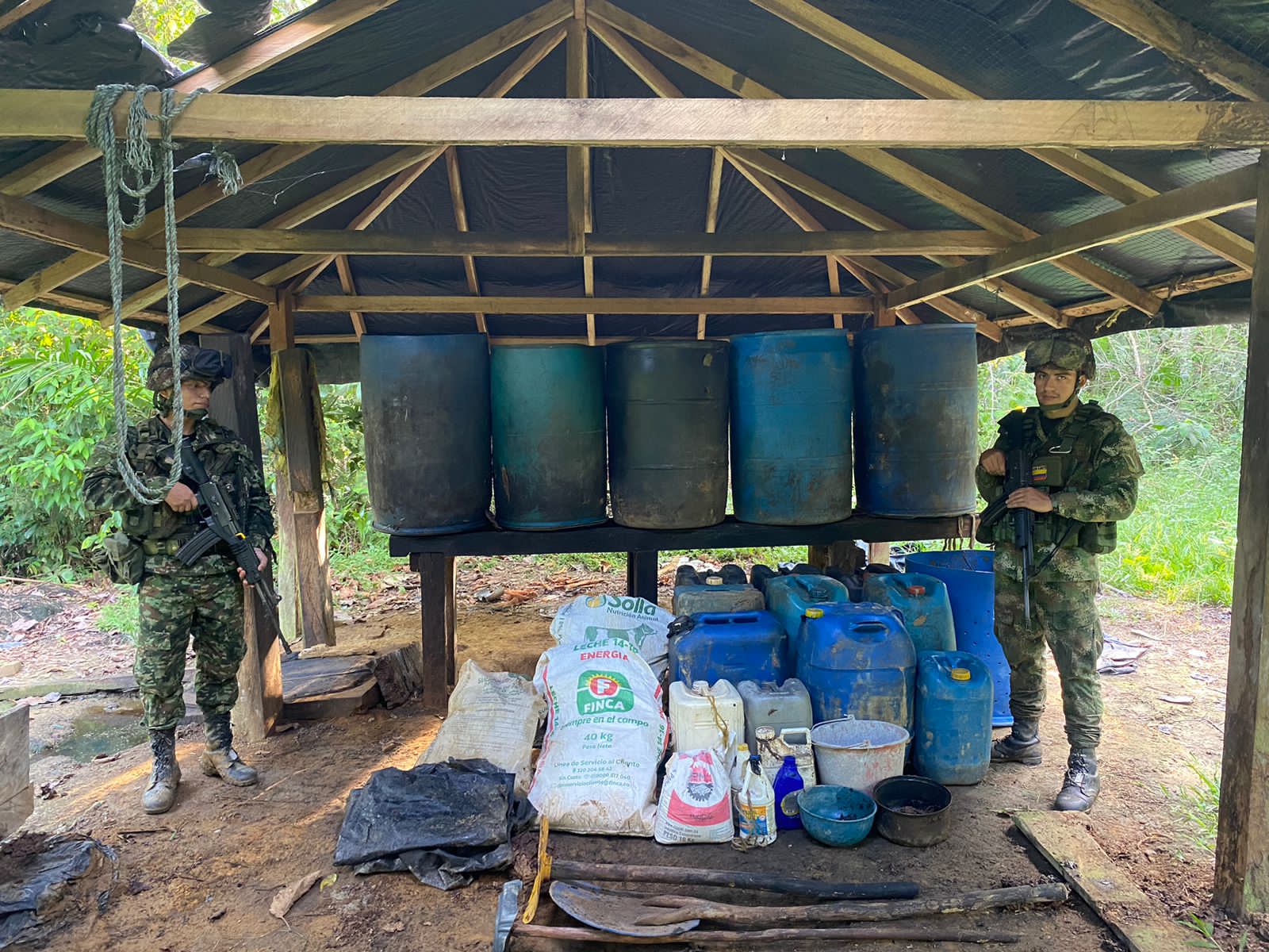 Entre el material ubicado las tropas encontraron 860 galones de pasta base de coca en solución, 1680 kilos de hoja de coca raspada, gasolina, cemento, cal, ACPM, amoniaco, urea, palas metálicas y rastrillos.