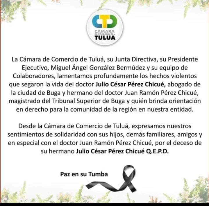 Uno de ellos fue por parte de la Cámara de Comercio de Tuluá, quienes manifestaron su solidaridad con le magistrado y su familia Pérez Chicue, a través de un comunicado público.