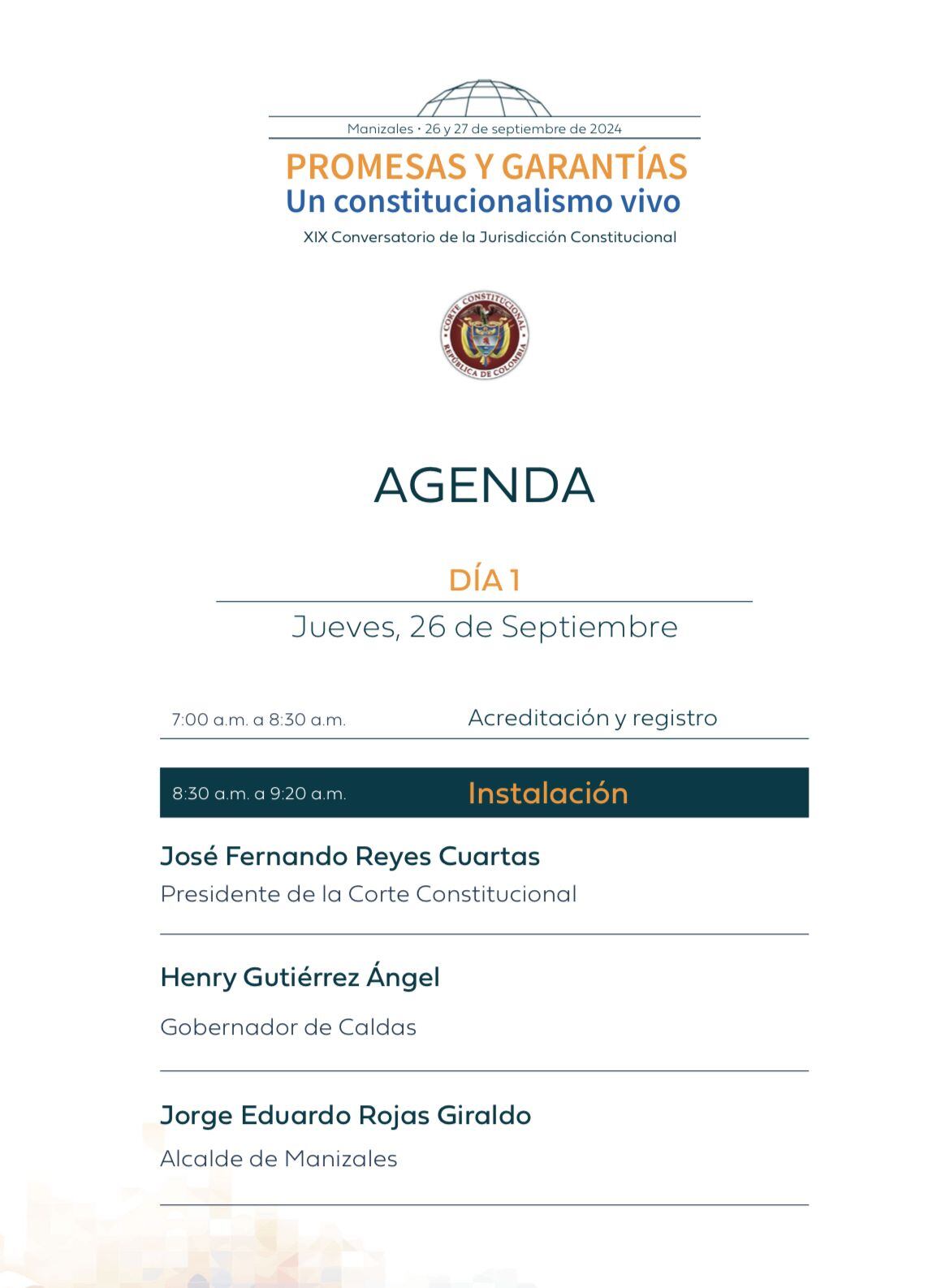 Este 26 y 27 de septiembre, Manizales será el epicentro para que 26 panelistas nacionales, 20 internacionales, comunidad académica, jueces constitucionales y la ciudadanía en general participen en el XIX Conversatorio de la Jurisdicción Constitucional. Promesas y garantías: un constitucionalismo vivo.