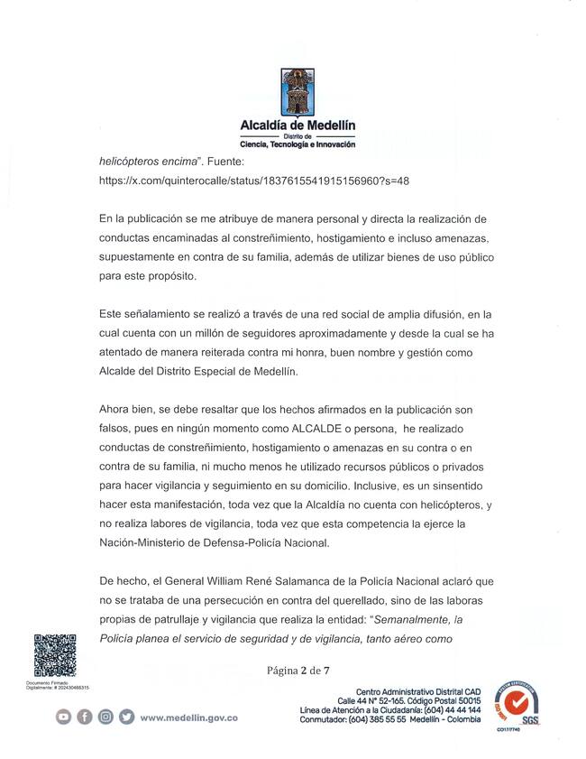 En el primer caso citado en la denuncia, el alcalde Gutiérrez menciona un mensaje publicado por Quintero en la red social X el pasado 21 de septiembre; allí se lee “alcalde Gutiérrez, aquí estoy y no le tengo miedo. Usted hizo que tuviera que sacar a mi familia de Medellín, pero no logrará sacarme así me tire 10 helicópteros encima”.