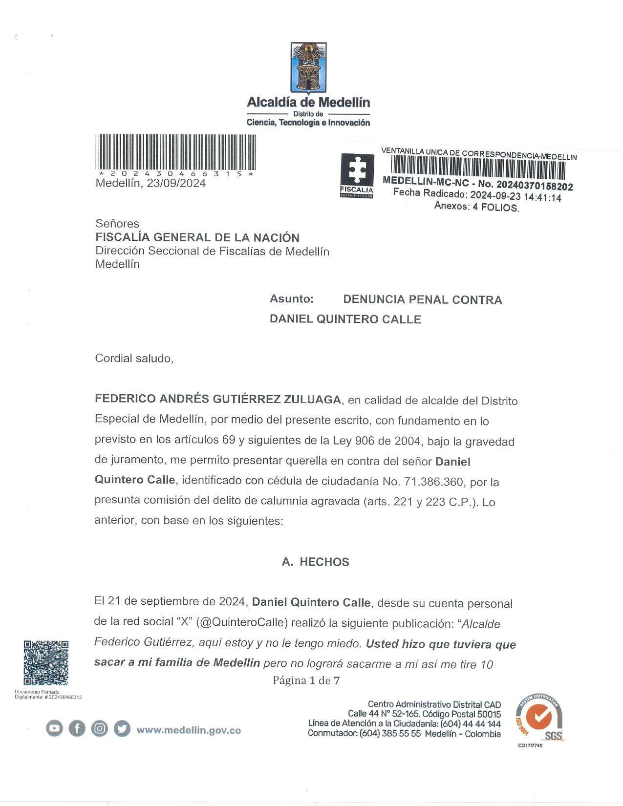 En el documento radicado a las 2:10 pm de este lunes 23 de septiembre, el actual alcalde argumenta la denuncia contra Quintero por dos puntos específicos, todos relacionados con supuestas persecuciones y amenazas.