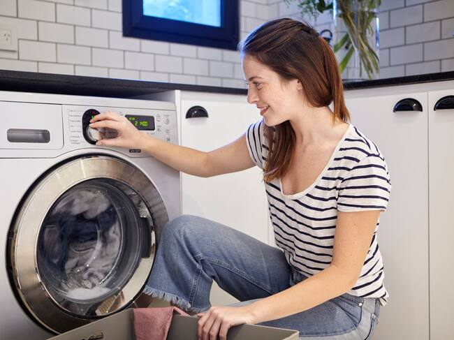 Mujer usando una lavadora para lavar ropa (Foto vía GettyImages)
