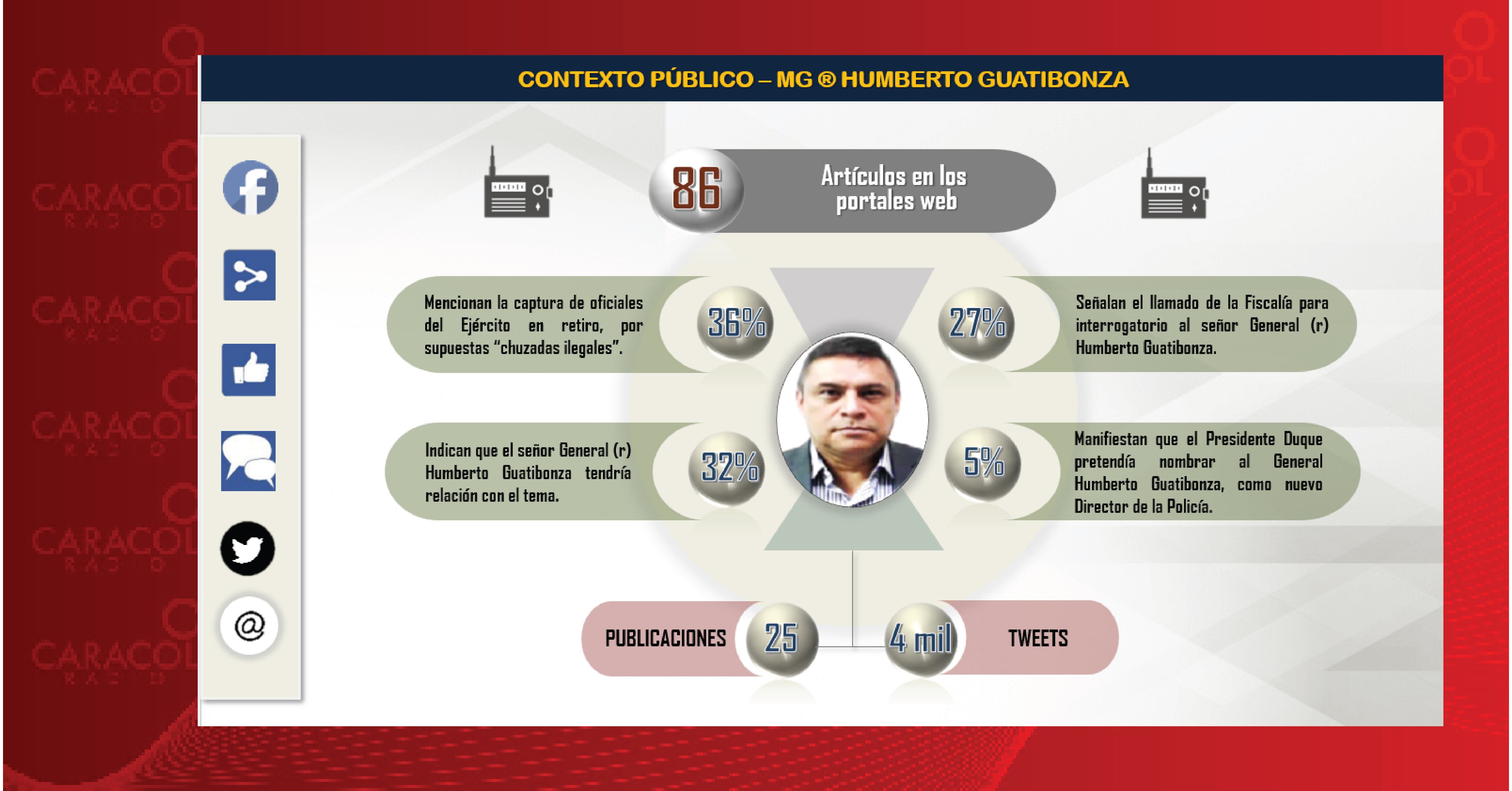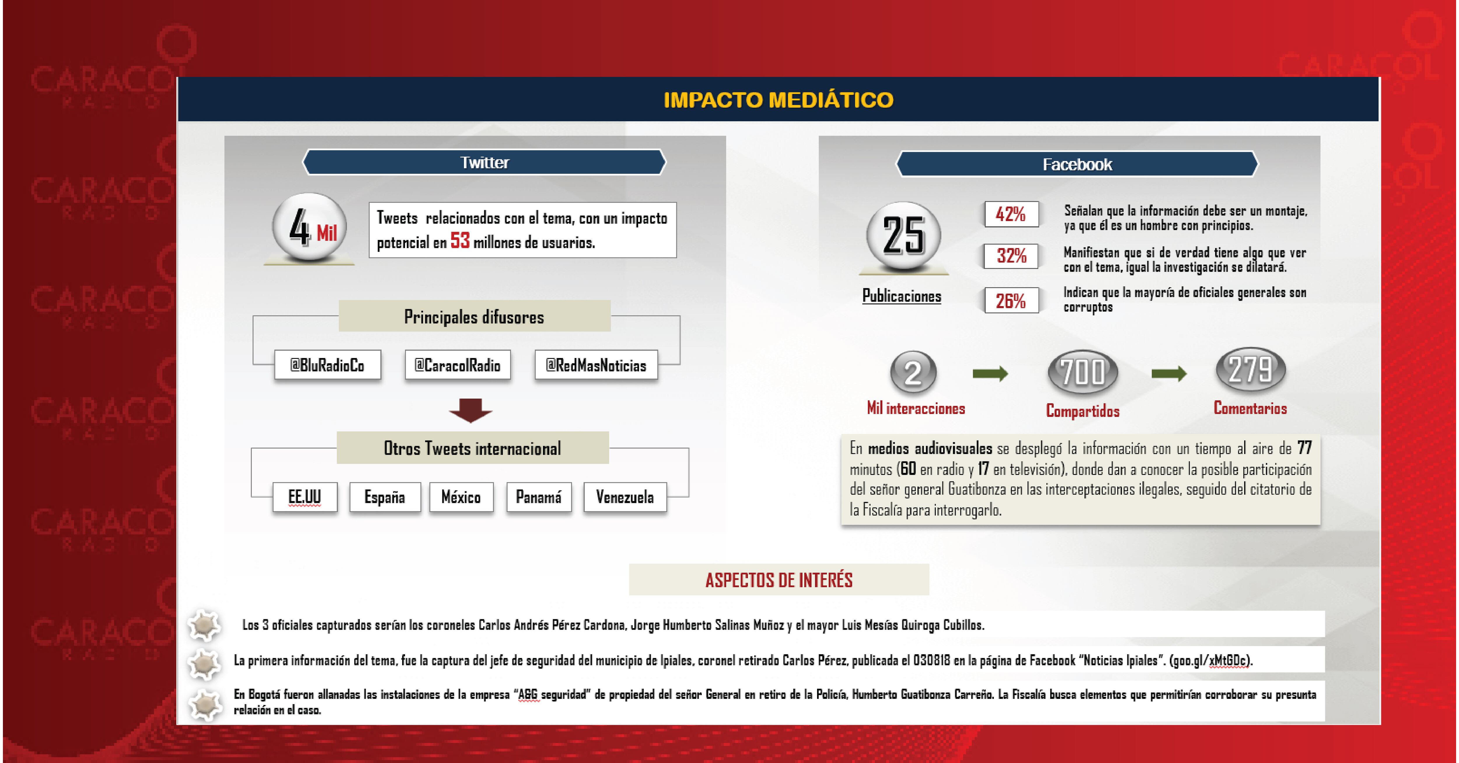 En medios audiovisuales se desplegó la información con un tiempo al aire de 77 minutos (60 en radio y 17 en televisión), donde dan a conocer la posible participación del señor general Guatibonza en las interceptaciones ilegales, seguido del citatorio de la Fiscalía para interrogarlo.