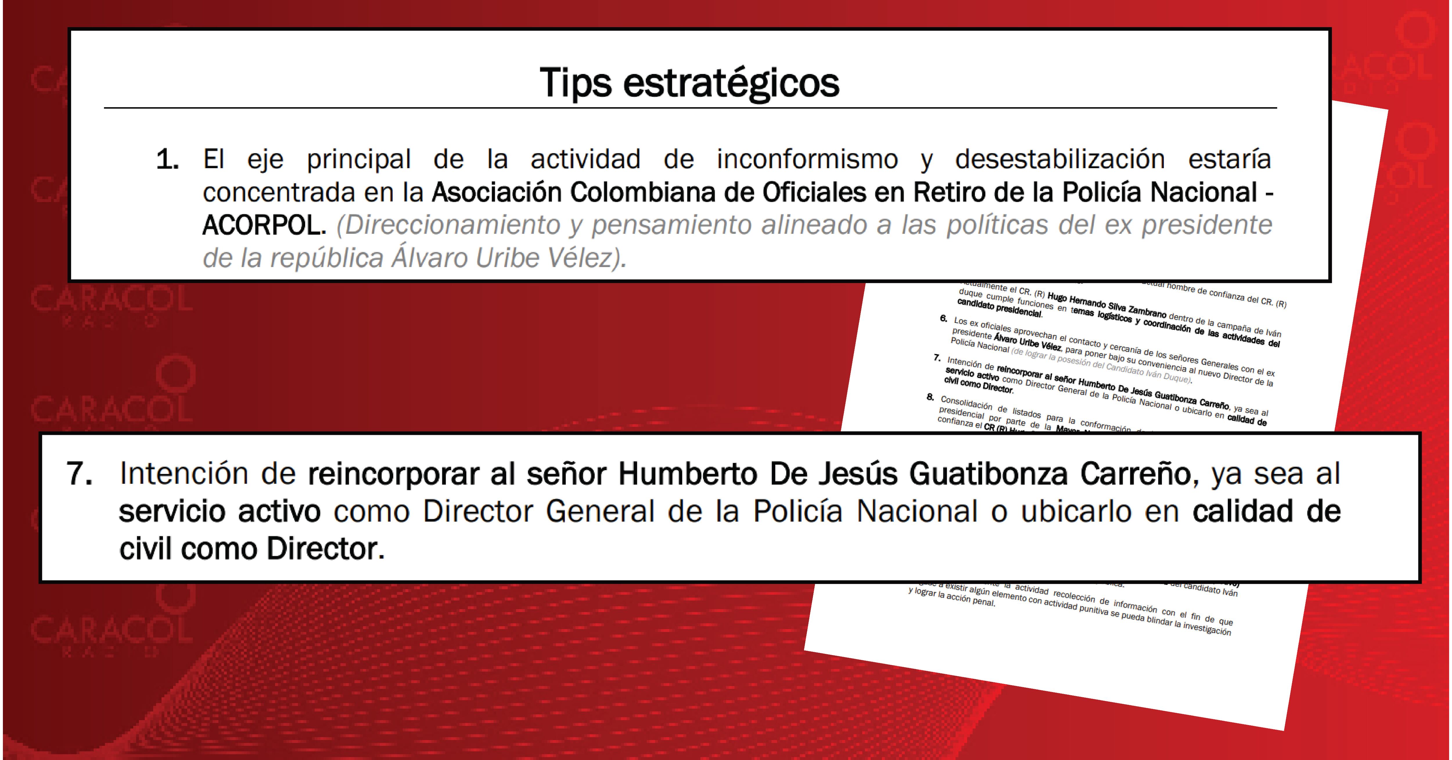 Por ahora el nombre clave de esos seguimientos desde la Policía se llamó “La operación TESEO”, y el apellido de Guatibonza fue uno de los focos principales porque inteligencia de la Policía Nacional, creía que él podría regresar, lo consideraban un candidato fuerte para ser el director de esa institución por su cercanía con los entonces candidatos Iván Duque y Gustavo Petro. ((ver documento))