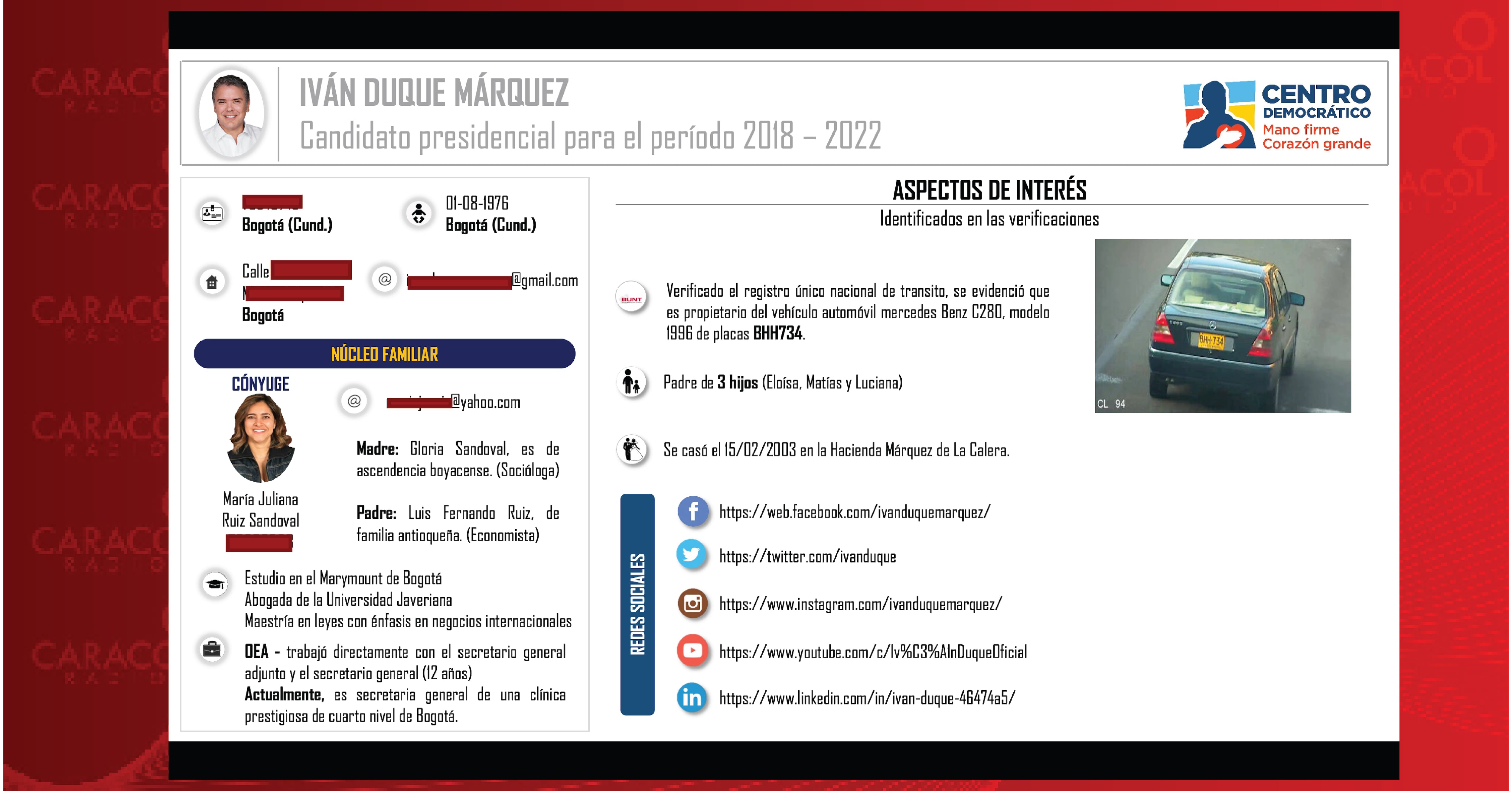 Desde la Policía Nacional perfilaron al entonces candidato Iván Duque y a su esposa María Juliana Ruiz. Aparecen los datos personales, datos de su núcleo familiar, también los diplomas del expresidente Duque, un comparendo, los datos de su vehículo y sus redes sociales.