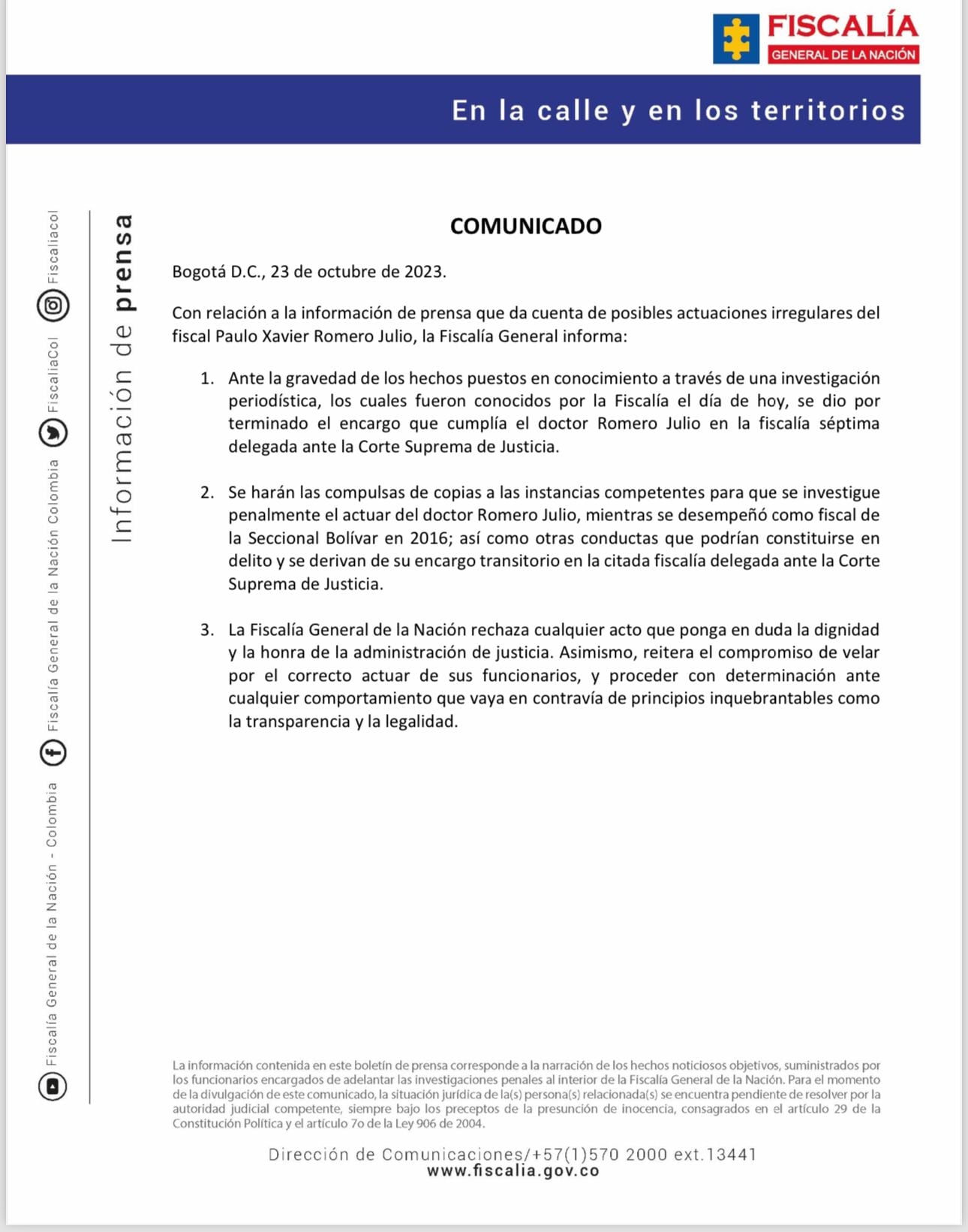 Con relación a la información de prensa que da cuenta de posibles actuaciones irregulares del fiscal Paulo Xavier Romero Julio, la Fiscalía General informa: