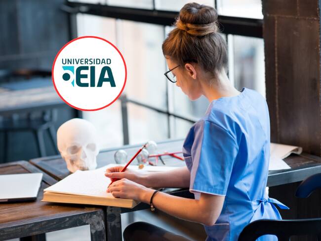 Mujer estudiando las ciencias de la salud y al lado el logo de la universidad EIA (Fotos vía Getty Images y redes sociales de la universidad EIA)