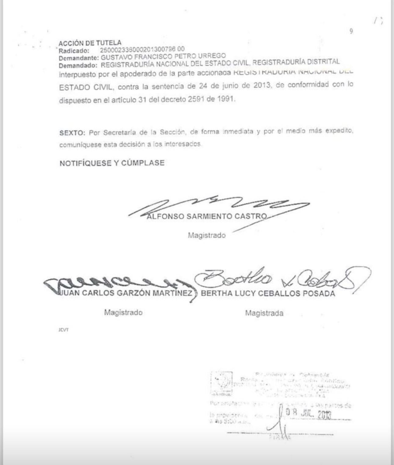 La decisión lleva las firmas de quien hoy representa a la Agencia de Defensa Jurídica, la magistrada que tiene que decidir y de un tercer magistrado Juan Carlos Garzón Martínez, otro antiguo compañero del ahora defensor y miembro de la misma sección que decidirá el pleito.