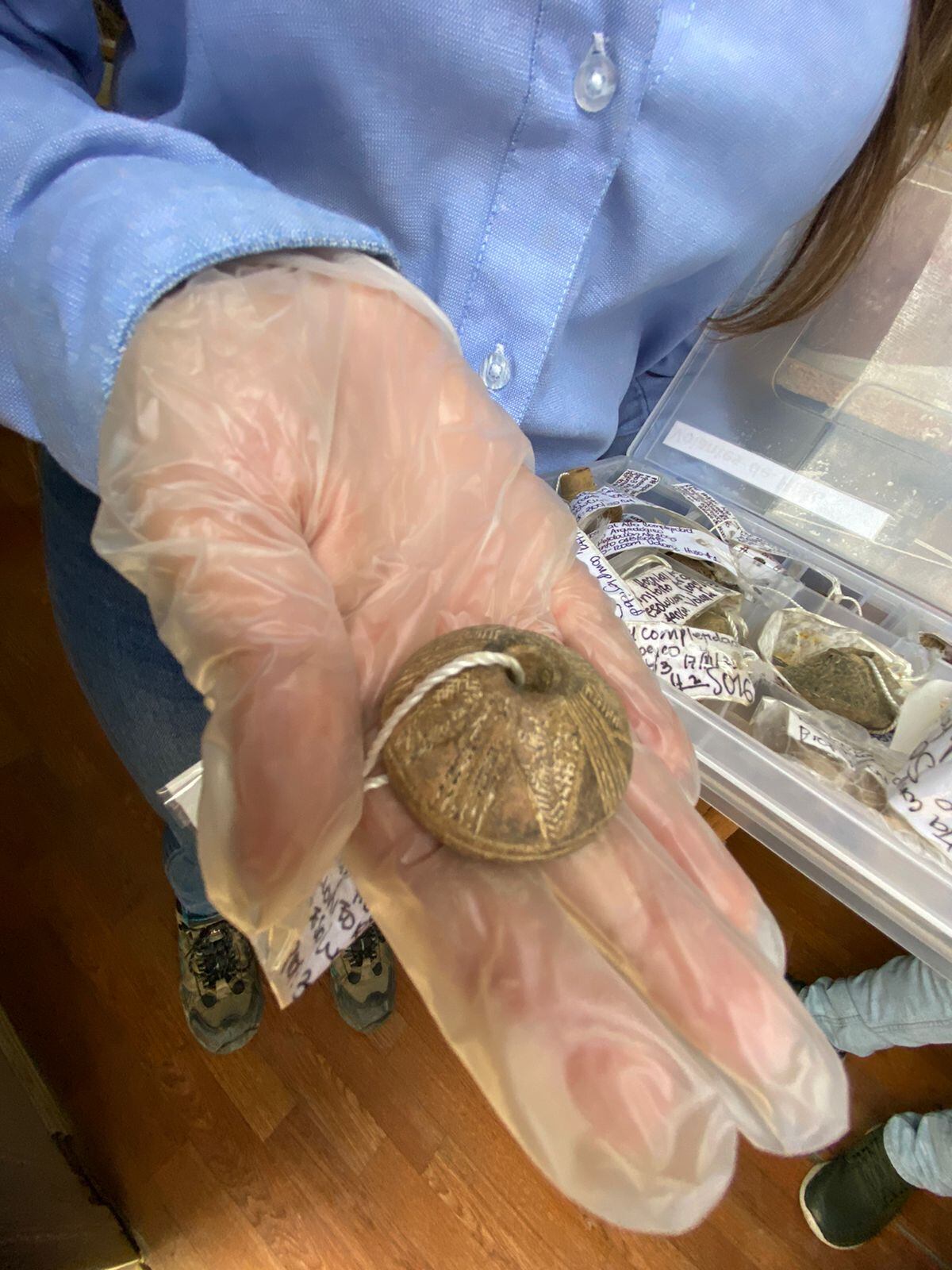 Entre las piezas halladas en este lugar, la arqueóloga destaca los volantes de huso, un cuerpo macizo con orificio vertical usado para hilar o coser, asociados a los Quimbayas, así como textiles y también restos de un equino.