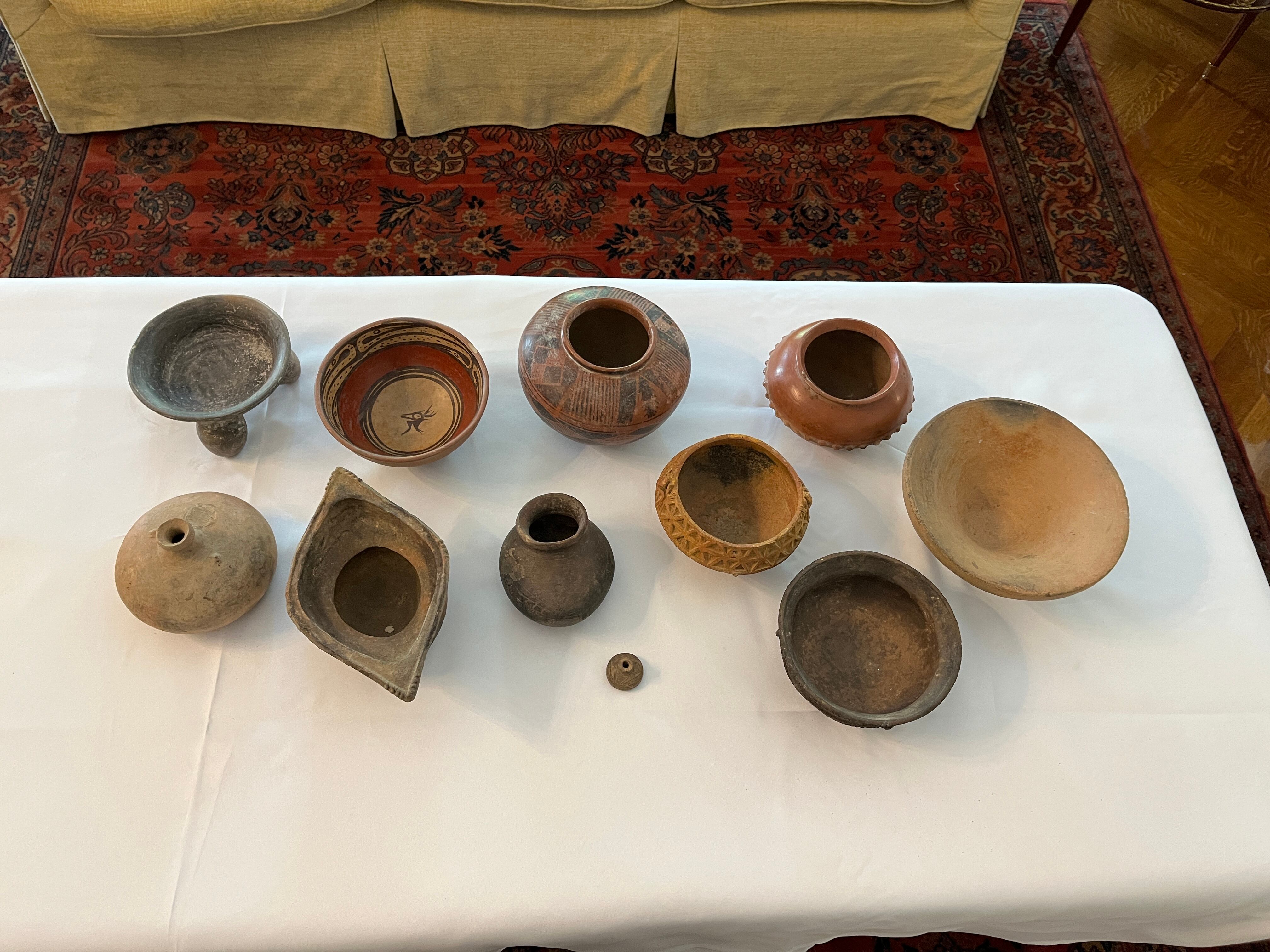 Respecto de la colección anónima entregada a la Embajada en marzo de 2024 se destaca que varias de ellas fueron identificadas como parte del patrimonio arqueológico nacional.
