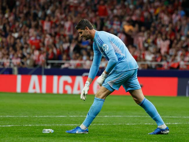 Un sector de la afición del Atlético de Madrid la tomó con Courtois, exjugador rojiblanco, cuando el portero dio al colegiado Mateo Busquets Ferrer, debutante en el derbi madrileño, un objeto que cayó en su área tras el tanto del Real Madrid.
