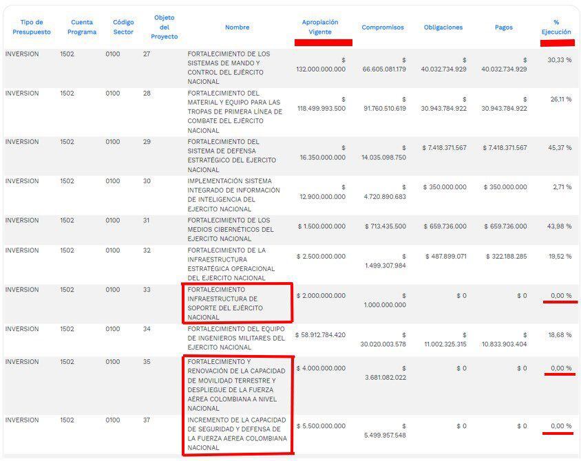 - Fortalecimiento infraestructura de soporte del Ejército Nacional: 0%.