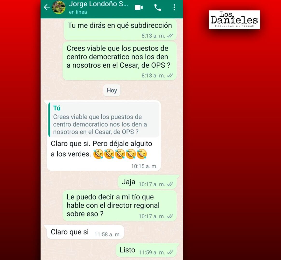 –Tú me dirás en que subdirección. Crees viable que los puestos del Centro Democrático nos los den a nosotros en el Cesar, de OPS?