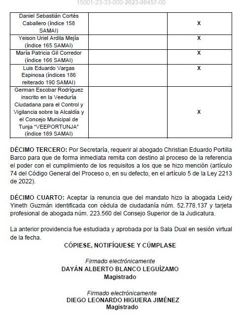 “Eso es un mensaje notorio de parte del honorable Tribunal Administrativo de Boyacá en donde cumpliendo un mandato del superior jerárquico como es el Consejo de Estado en el recurso de apelación del 6 de junio de 2024 le manifiesta que tenía que hacer lo dispuesto para la admisión de la demanda, pues por fin se dio ese cumplimiento”, afirmó el abogado Marco Antonio Palma.