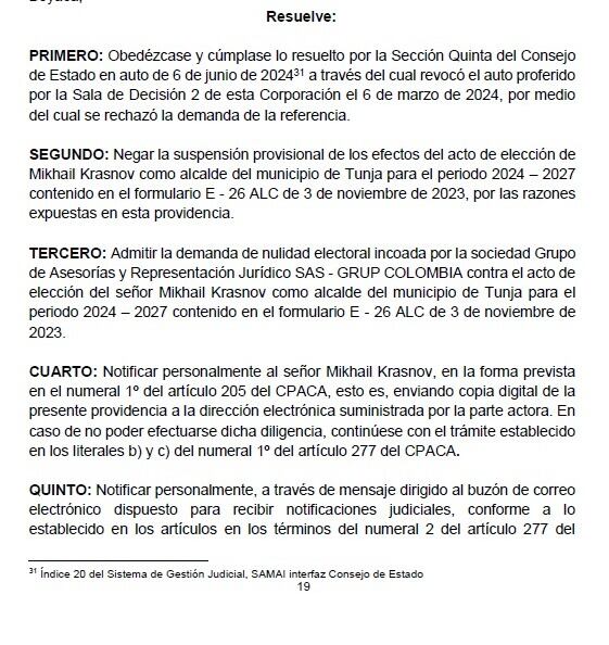 El Tribunal Administrativo de Boyacá admitió la demanda de nulidad contra la elección de Mikhail Krasnov como alcalde de Tunja presentada por la sociedad Grupo de Asesorías y Representación Jurídico SAS - GRUP COLOMBIA, el abogado celebró la decisión.