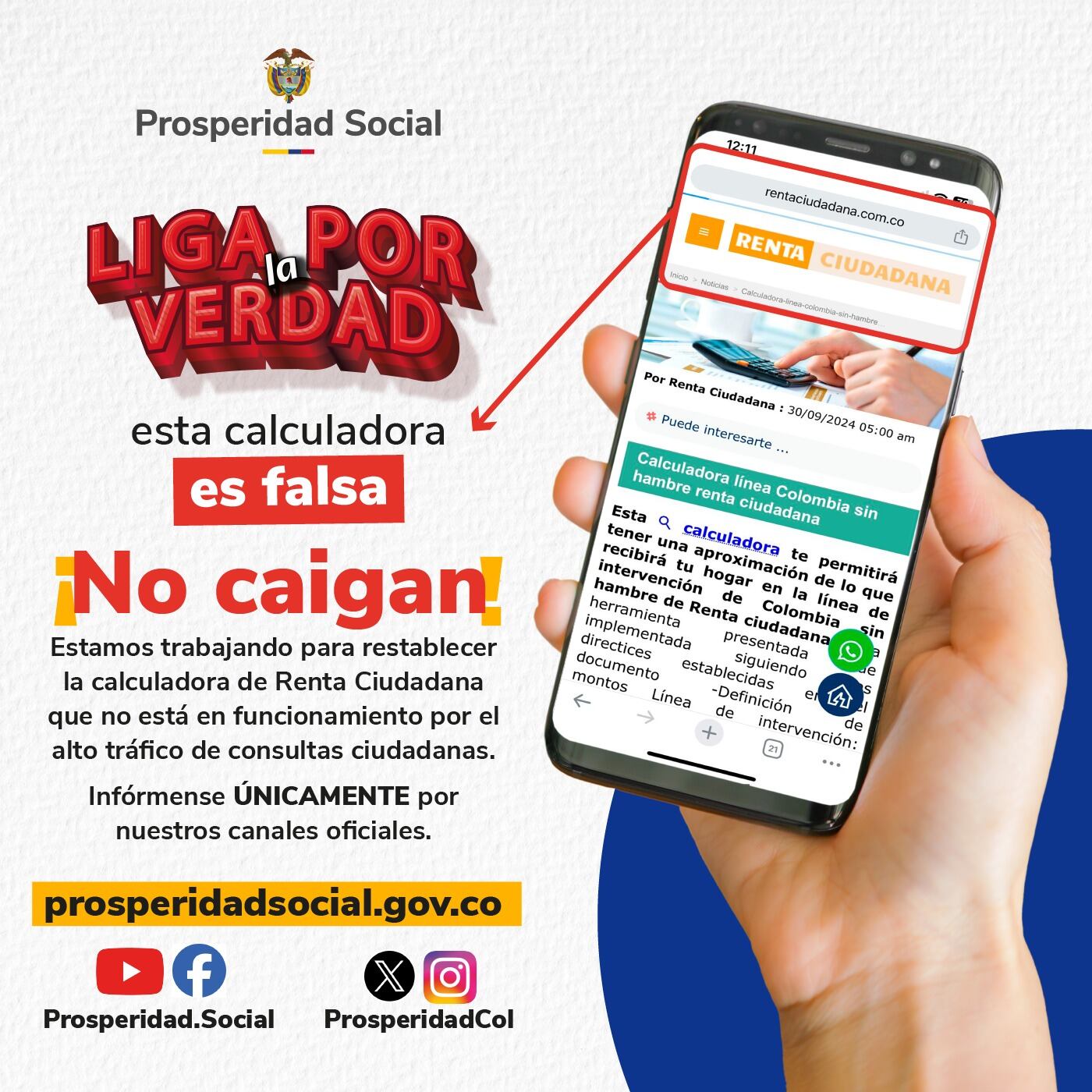 Desde el DPS aclararon que la calculadora de Renta Ciudadana solo está disponible en la página web oficial del programa, ya que se dieron a conocer URLS falsos. Es importante verificar la fuente para asegurarse de que la información sea confiable: https://prosperidadsocial.gov.co/sgpp/transferencias/renta-ciudadana/