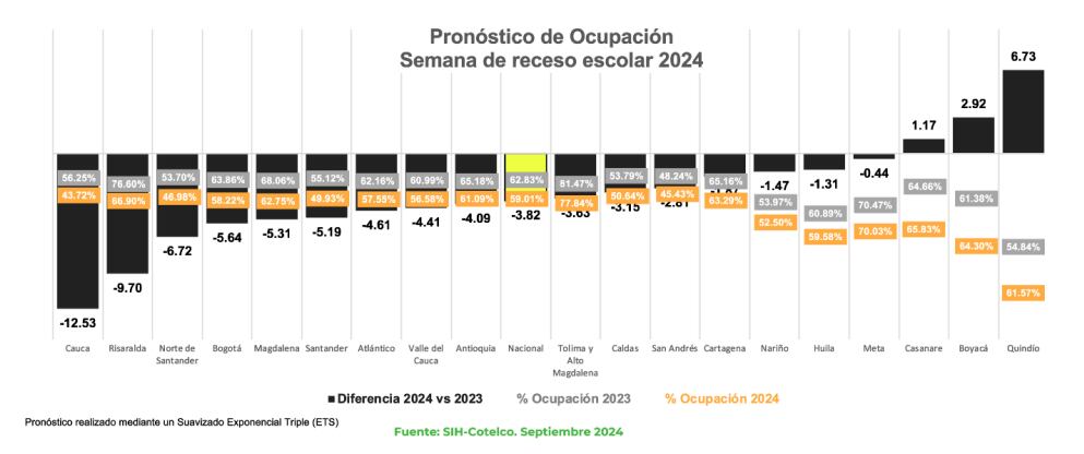 De acuerdo con cifras del Sistema de Información Hotelero (SIH) de Cotelco, para la semana de receso escolar de este año se proyecta una ocupación del 59,01%, lo que representa una disminución de 3,82 puntos porcentuales (p.p.) respecto a la semana de receso escolar de 2023.