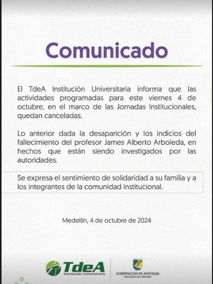 El docente universitario que trabajaba en la facultad de Ciencias Administrativas y Económicas del TdeA había sido reportado como desaparecido desde el pasado jueves 03 de octubre desde cuando no se volvió a saber de él, pero luego de la búsqueda fue encontrado sin vida. Según el reporte preliminar del Sistema de Información para la Seguridad y la Convivencia - SISC de la secretaría de seguridad de Medellín, las autoridades realizaron la inspección técnica a un cuerpo el jueves “un hombre no identificado, entre 30 y 35 años, quien presentaba múltiples heridas en distintas partes del cuerpo, ocasionadas con arma cortopunzante. En estos mismos hechos resultó herida otra persona, también por arma cortopunzante”, señaló el reporte oficial.