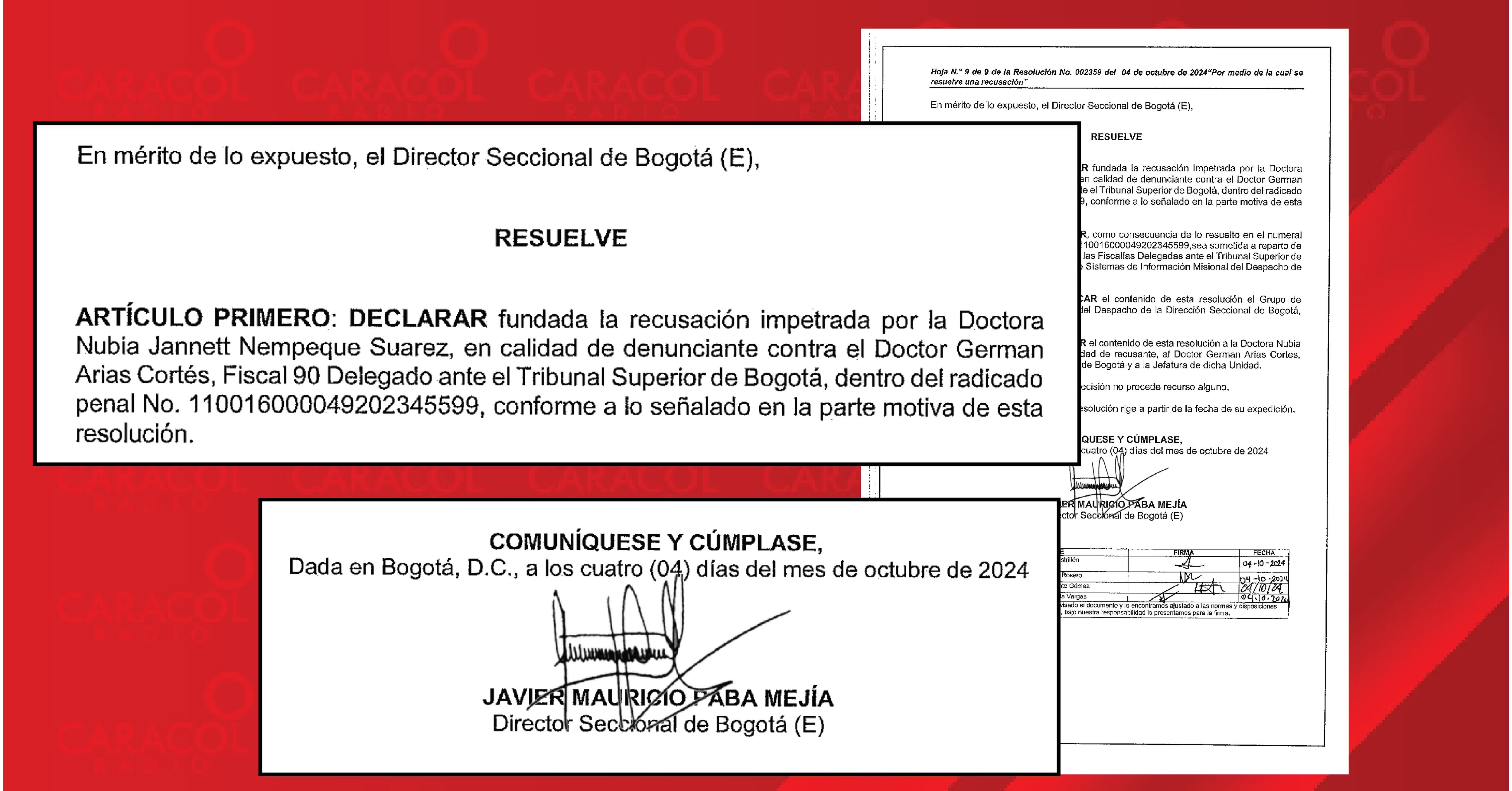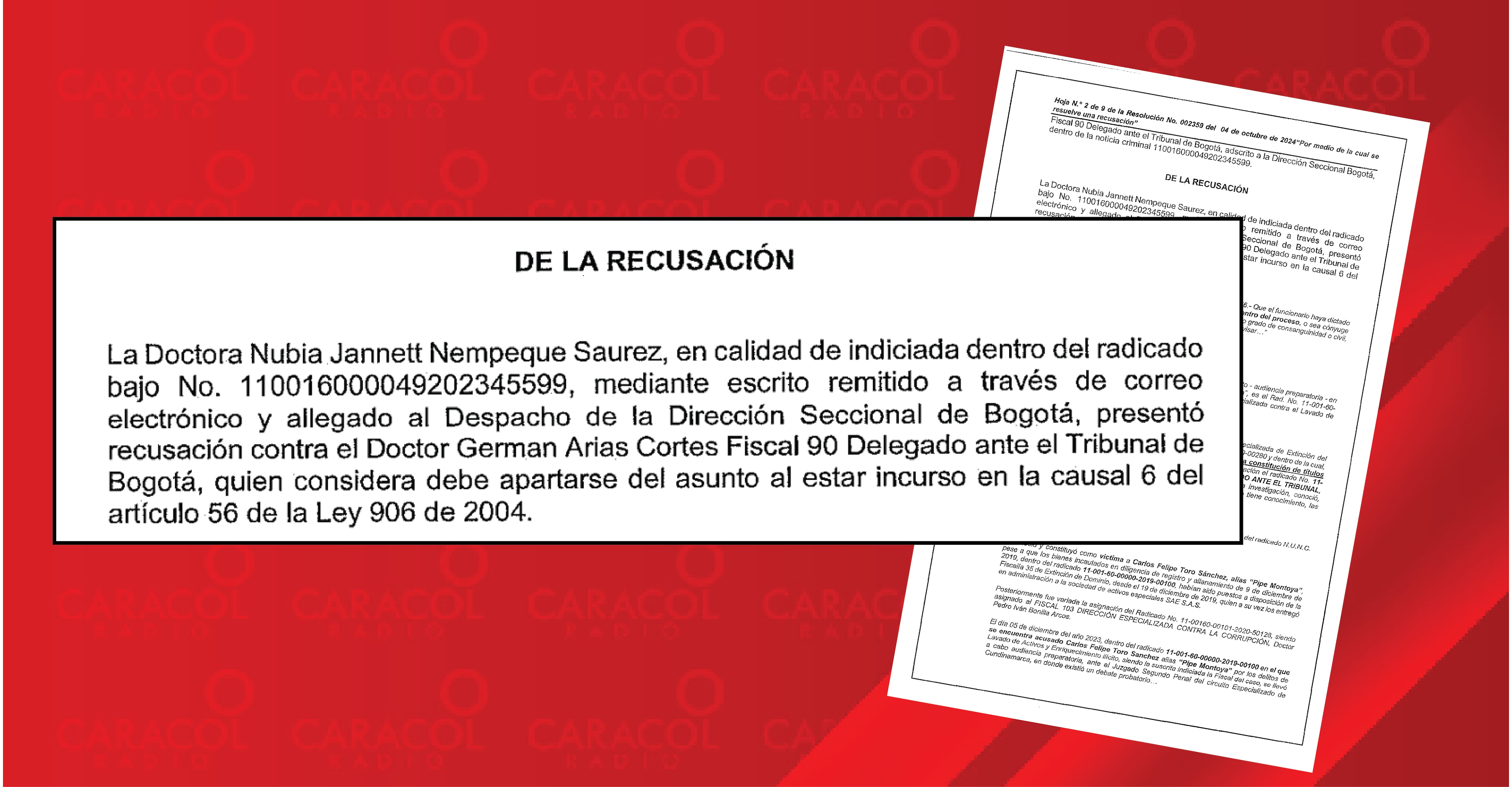 Aquí es donde viene la otra irregularidad. La investigada fiscal Nubia Nempeque radicó la recusación ante la dirección seccional Bogotá, y ese funcionario, omitiendo el reglamento de la Fiscalía, decidió apartar del caso al fiscal Germán Arias. ((VER DOCUMENTO))