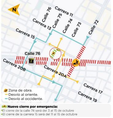 La calle 74 quedará totalmente cerrada desde la avenida Caracas hasta la carrera 15 hasta el 10 de octubre a las 23:59 horas. Cómo desvío, para cruzar sentido Occidente oriente, se habilitará la calle 73 (cambio sentido vial), y en sentido oriente occidente, se utilizará la calle 76.