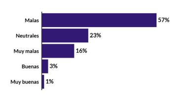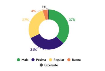 La mayor parte del sector de empresarios del país, consideró que la situación económica del país, comparada con la de hace 12 meses, es mala o pésima (68%), otra asegura que es regular (27%) y solo el 5% considera que es buena.